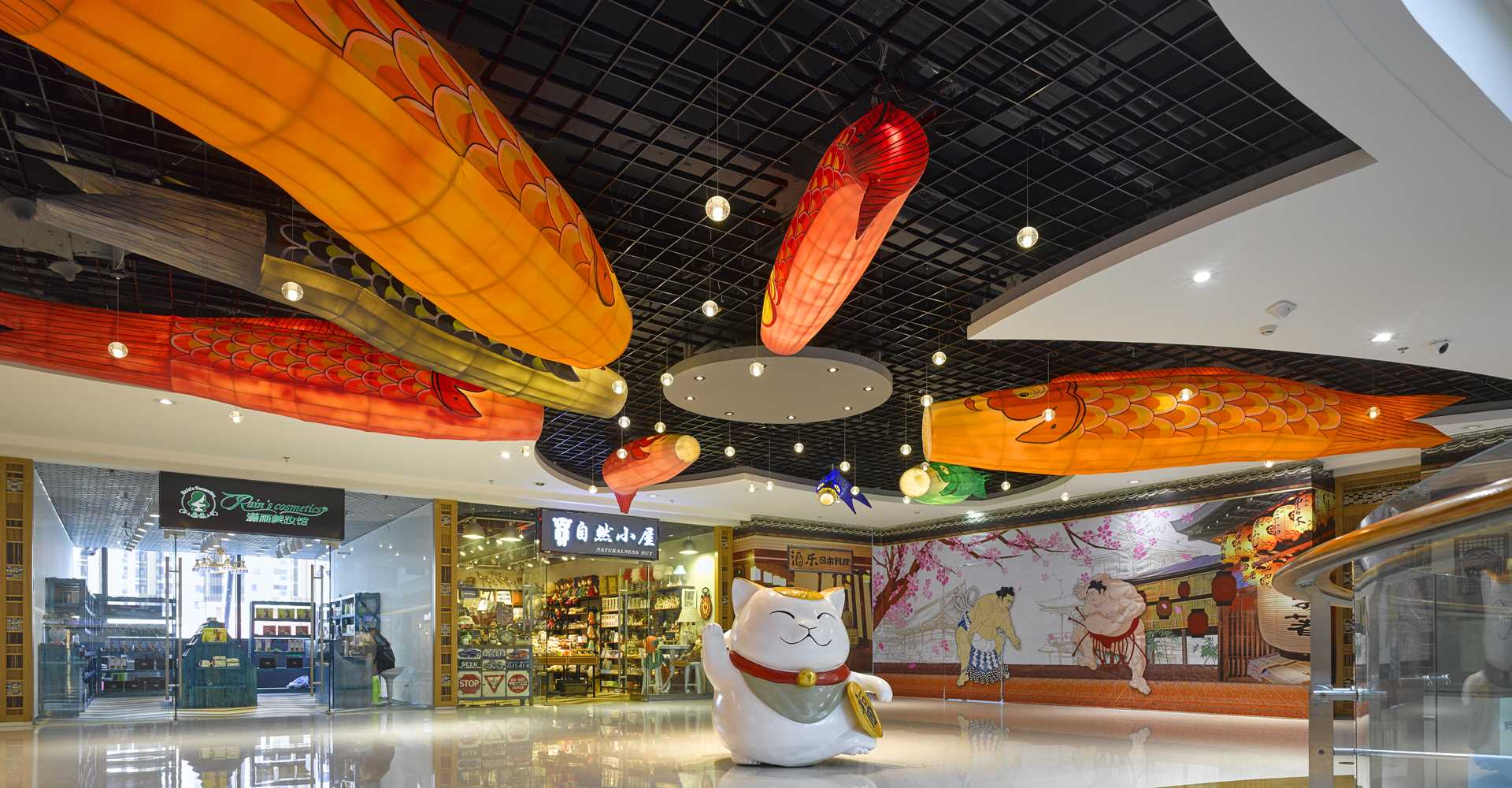 Our Work 购物中心 Shopping Center 中骏日韩区改造项目位于泉州中骏世界城的二层,3000平方米左右的区域。本次设计目的是营造日韩风格街区,设计理念是通过较多软装陈设装置来烘托出强烈的设计氛围。首先,软装方面我们从日韩经典古典元素一直到现代流行元素,加以结合、融合,提炼出最佳的设计元素,通过我方设计改造出原创的形象及组合。例如∶在主入口,所设计的造型组合是一只憨态可掬的招财猫,牵着10条鲤鱼旗,其中大小不一的鲤鱼旗最大只的则将尾巴甩出规定区域,引客入街。